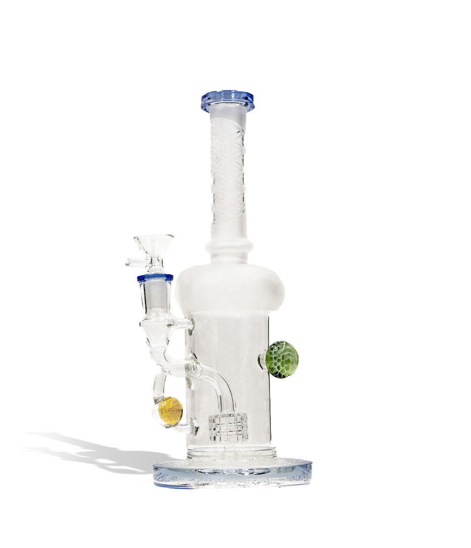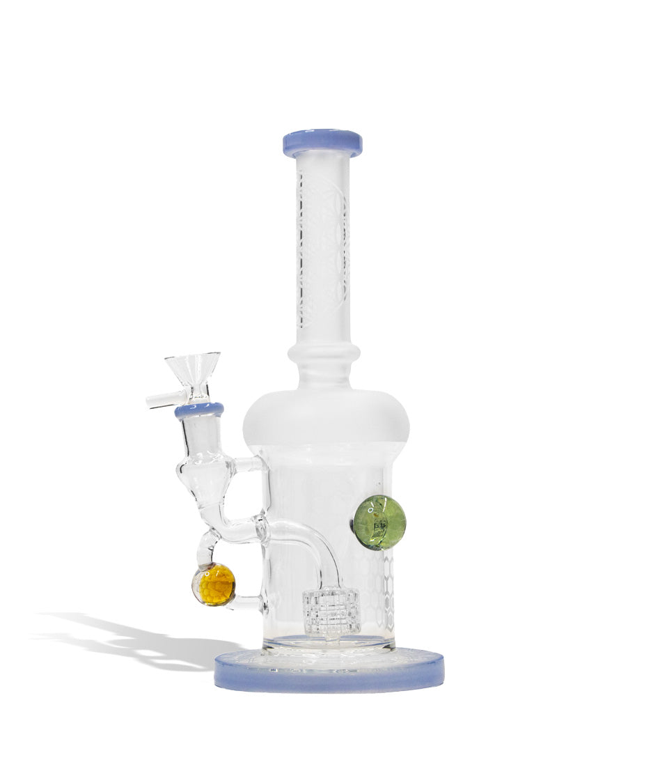Milky Blue 9 inch water pipe with honey comb perc and 14mm funnel bowl on white studio background