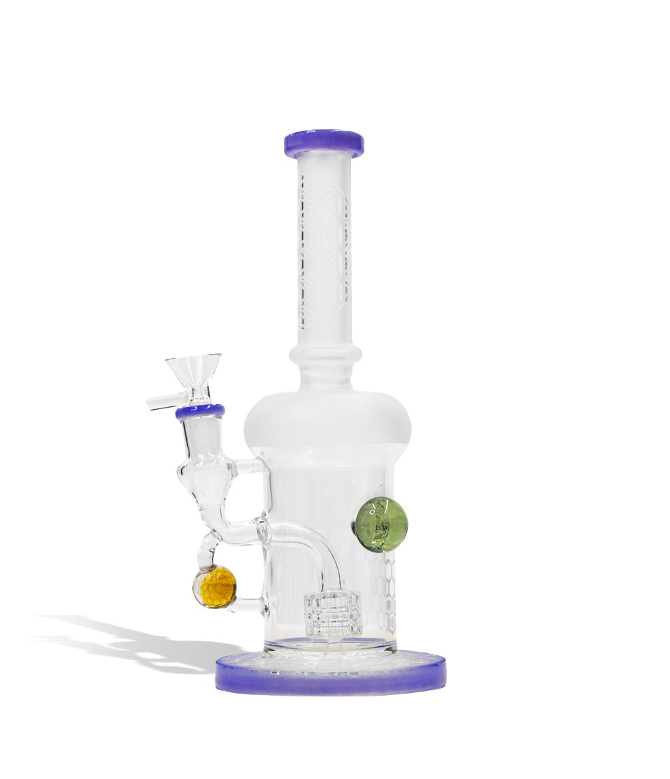 Milk Purple 9 inch water pipe with honey comb perc and 14mm funnel bowl on white studio background